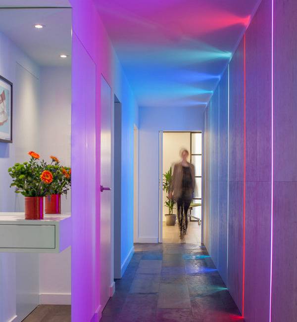 Если в узком коридоре недостаточно естественного освещения можно пойти ещё на одну уловку — оборудовать его красивой цветной подсветкой. Посмотрите, насколько оригинально это смотрится!