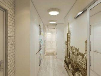 Правильно расположенные светильники по центру длинных стен тоже создадут световое затемнение у торцов. Фото дизайна прихожей для узкого коридора помогут правильно сориентироваться с оформлением и подобрать нужный вариант.
