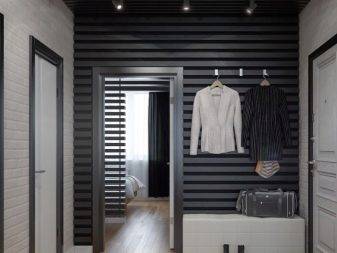 - При дизайне узких прихожих и коридоров необходимо визуально устранить недостатки геометрии помещения и продумать расположение вещей: