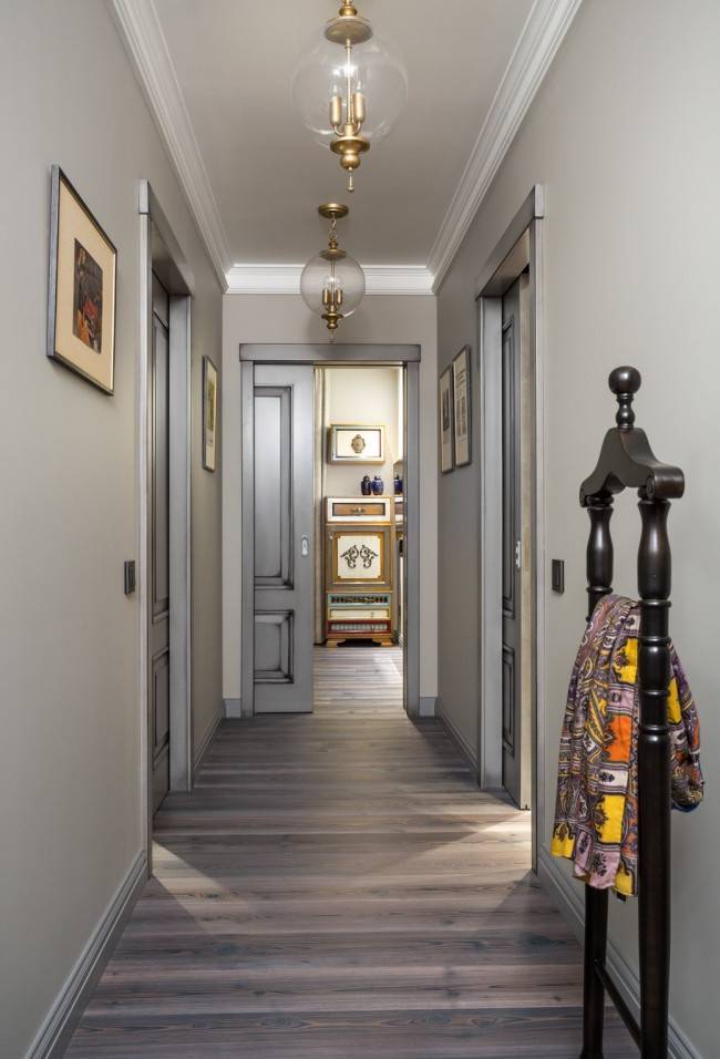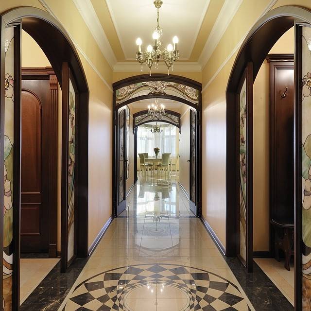 Когда оформление квартиры выдержано в духе английской классики или допускает налет античности, недостатки слишком длинного коридора легко превратить в достоинства. Анфилада арок или прямоугольных порталов – классический прием, позволяющий создать благородную перспективу.