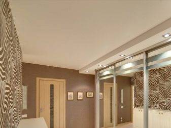 Потолки в коридорах чаще всего оформляются в белом или другом светлом цвете. Даже двухуровневые и балочные варианты порой не образуют контраста. Однако в иных случаях небольшие участки многоярусного потолка могут быть окрашены в темный или более яркий тон.
