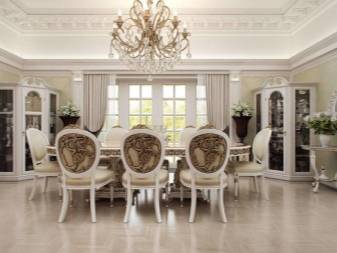 Главными цветами в помещении выступают молочный, белый, бежевый, которые разбавляются вкраплениями ярких аксессуаров. Основным правилом является наличие высоких потолков с лепниной и мебели из дерева, отсутствие обоев