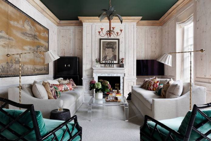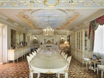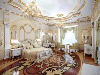 Если размер вашей квартиры не позволяет сделать высокие величественные потолки, украшенные лепниной или росписью — обратитесь к более практичному варианту. Например, оставьте потолок попросту белым или украсьте его деревом. Не забудьте только массивную люстру, выполненную в витиеватом стиле (особым шиком будет лампа с настоящими свечами внутри, однако это, конечно, не очень удобно).