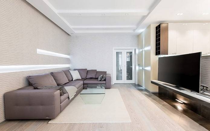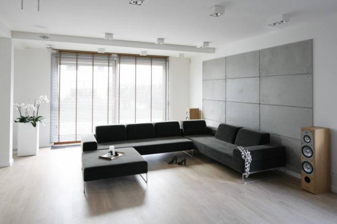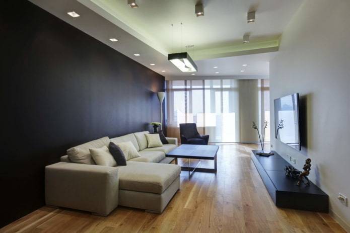 Лучшим решением для стиля минимализм является отделка в виде ламината или натурального дерева, которое смотрится изящно, тепло, уютно и благодаря древесной фактуре становится безупречным дополнением интерьера. Экологичным, роскошным и дорогим материалом считается паркет. Пол в минималистичной гостиной можно оформить доской в темных, светлых или выбеленных тонах.