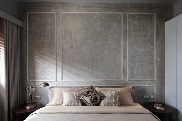 На фото спальная комната со стеной, оформленной белыми молдингами из полиуретана.