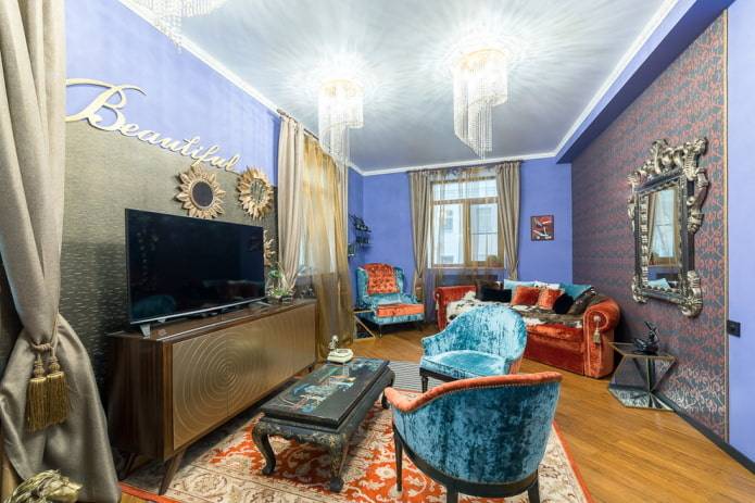 Комната для гостей – то место, где интерьер квартиры в стиле фьюжн раскрывается во всей красе. Разноцветные ковры, мягкие диваны с обилием подушек, сочетание фактур в отделке стен и потолка – уместно всё, что по душе владельцу квартиры. Не в почете только беспорядочность.