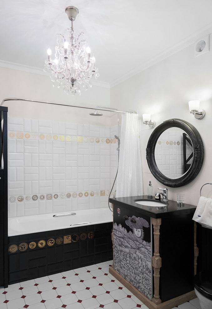 Казалось бы, санузел – не то место, где можно проявить фантазию и сочетать множество фактур. Но даже если площадь ограничена, ничто не мешает выкрасить одну или несколько стен в насыщенные цвета, добавить пару картин, выбрать яркую штору для душа и постелить оригинальный коврик.