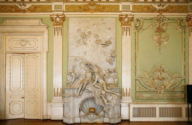 - Гипс. Массивный гипсовый декор, ассоциирующийся с лепниной и дворцовыми украшениями гармонично вписывается в классические интерьеры, а также дополняет такие стили, как ренессанс или рококо.