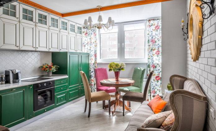 Бюджетным (и любимым многими) приемом остается комбинирование различных по цвету и дизайну стульев для обеденной группы. Стены украшаются картинами и даже зеркалами.