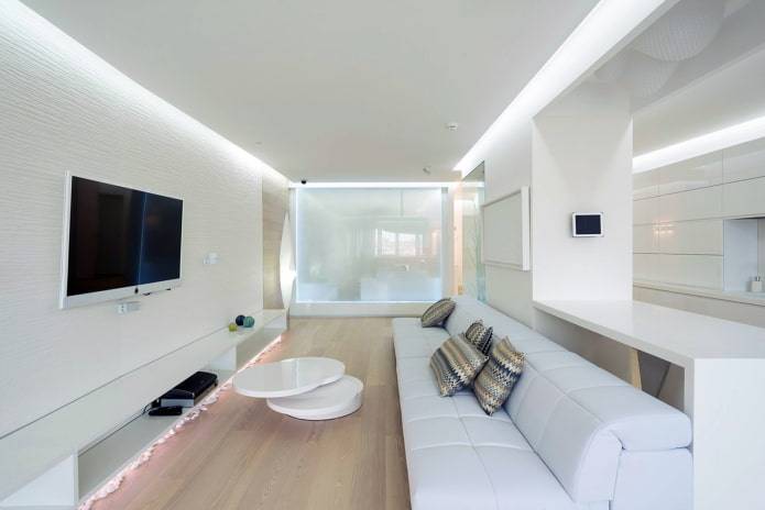 На фото гостиная в стиле минимализм с белым подвесным потолком, декорированным подсветкой.