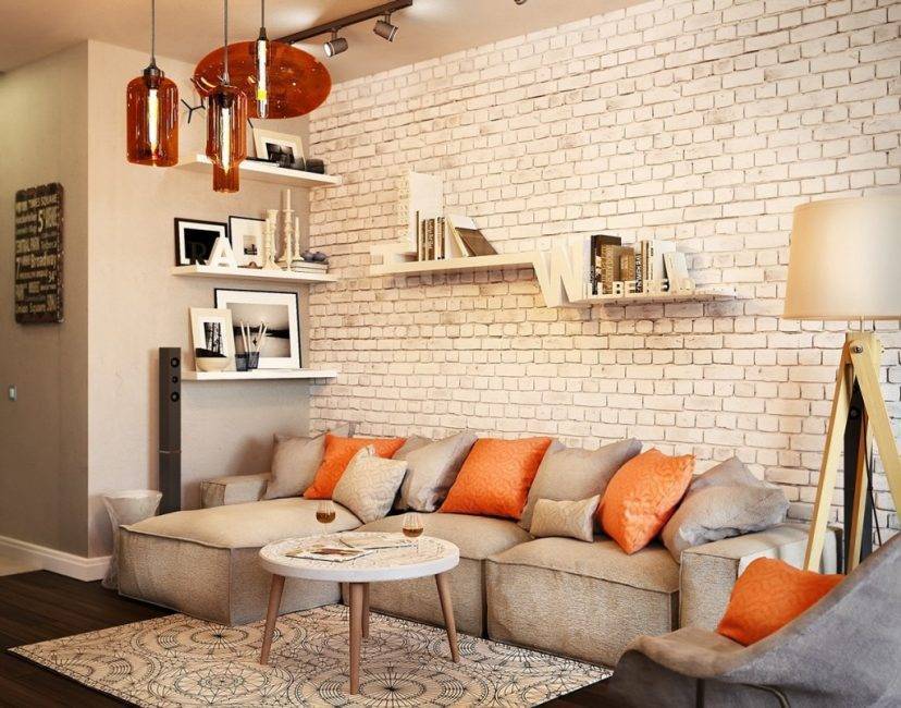 Акцентную стену в гостиной можно выложить кирпичом и выкрасить ее в белые, серые, рыжие или шоколадные тона. Такой вариант отделки наделит интерьер динамичностью и создаст в нем интересный контраст.