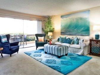Этот пример совсем не похож на предыдущий. Тут используется минимальное количество деталей. Основные цвета – белый, голубой и серый. В этой же цветовой гамме выполнен и декор. Красивая люстра, современный торшер, стеклянные вазы и мелкие фигурки на журнальном столике. Пустую белую стену украшает одна единственная картина на морскую тематику. Тут нет ничего лишнего, но в то же время помещение выглядит продуманным и комфортным для жизни.