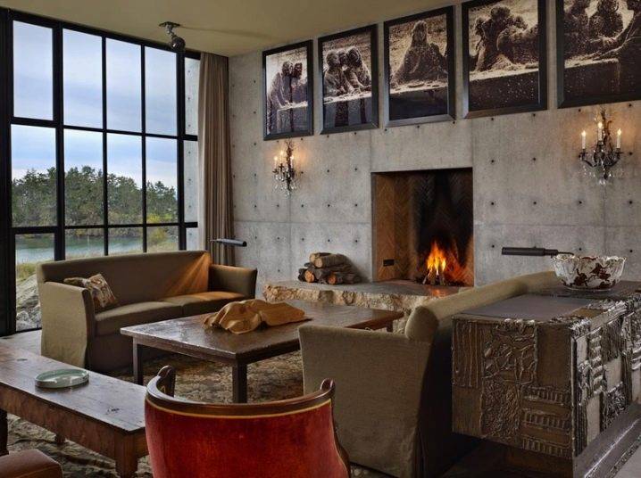 Гостиная в стиле брутализм смотрится стильно и необычно: картины в единой тематике на фоне бетонной стены удачно вписываются в интерьер пространства и подчеркиваются идентичным цветом рамы панорамного окна, стильные диванчики у камина способствуют гостеприимной атмосфере.