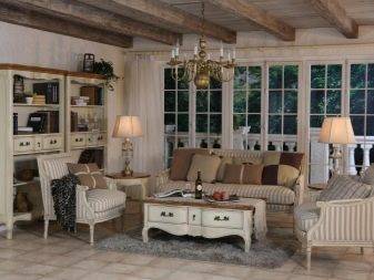 Декоративная мебель гостиной должна иметь изогнутые ножки с вырезанными узорами. Пол следует выкладывать плиткой, ни в коем случае не покрывая ее ковром. Обивку деревянной мебели желательно выбирать светлых тонов с акварельными цветочными узорами. Идеальным вариантом оформления комнаты будет наполнение ее мебелью выполненной в технике «искусственного состаривания», имитирующей потертости, царапины и сколы.