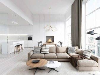 - Если пространство включает совмещенную кухню или столовую, здесь необходимо использовать зонирование, равномерно и гармонично распределять оттеночную палитру, грамотно использовать акценты.