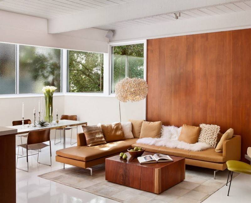 В большую квадратную гостиную можно установить комплект мягкой мебели шоколадного оттенка, «наполняющий» комнату теплом.