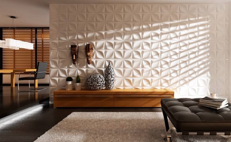 На фото показан пример выделения зоны гостиной с помощью 3D-панелей