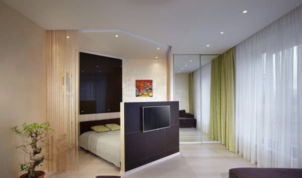 Шторы, занавеси наиболее уместны в гостиной-спальне площадью 16 квадратных метров. Преимущество ткани – гибкость, пластичность. Тут не будет стабильных перегородок, которые своей угловатостью могут помешать передвижению.