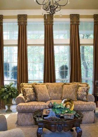 Массивные шторы со складками, ламбрекенами утяжеляют комнату, для маленькой гостиной подходят легкие занавески, жалюзи с фотопечатью.
