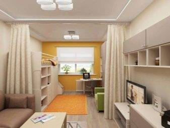 - Разделение с помощью ткани – шторы, разделяющие пространство всегда можно раздвинуть и вновь объединить комнату;