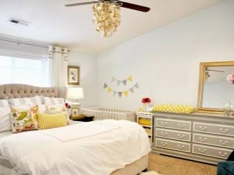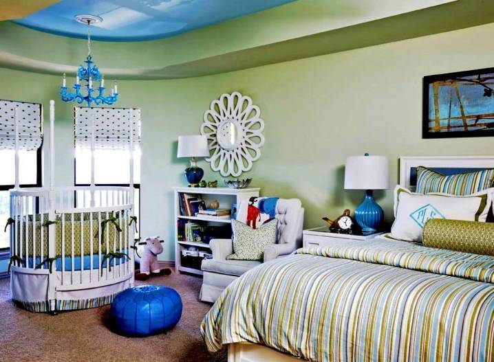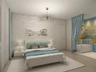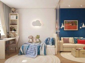 В светлых и просторных комнатах найдут свое место объемный тканый диванчик, белый круглый пуфик, белоснежная тумба под ТВ, телевизор и детская кроватка. Разделить две зоны можно при помощи красивых белоснежных штор или необычной формы перегородки. Например, в помещении с голубыми стенами будут прекрасно смотреться легкие полотна с красивыми синими лентами. Постелите на пол нежно-коричневый ламинат и завершите ансамбль монохромными настенными картинами, а также люстрой с хрустальными подвесками.