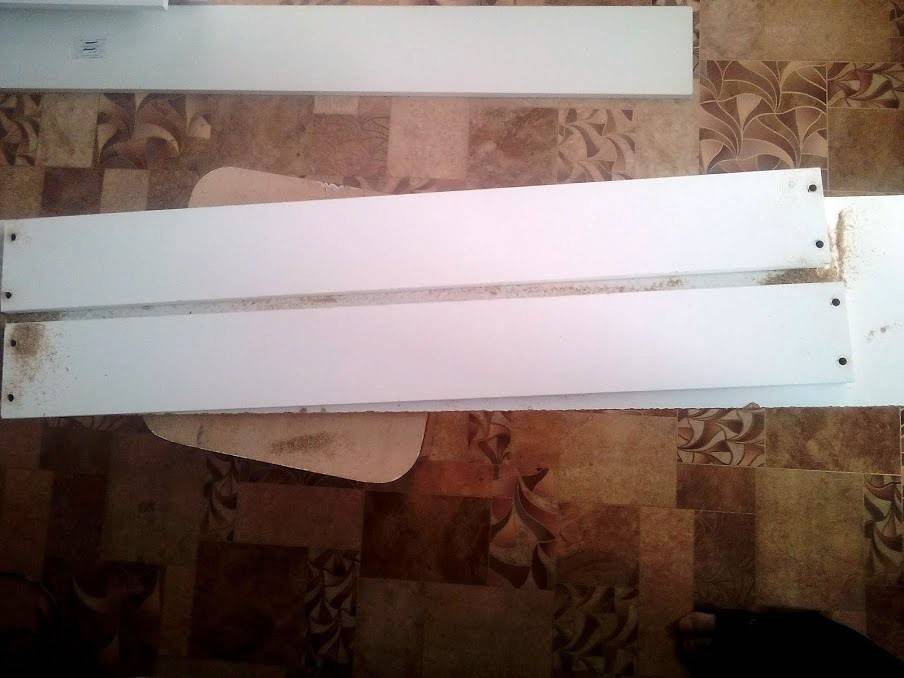 - Создается основа из ДСП. Подойдут листы шириной 27 см и глубиной 50 см. К ним крепятся пластиковые ножки. К передним панелям на высоте 10 см при помощи клипс фиксируется цокольная планка.