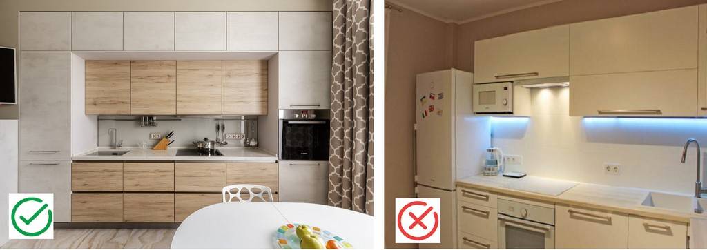 Отдельностоящий холодильник визуально режет помещение. А пространство над ним не всегда рационально используется. Чтобы не допустить подобного необходимо: