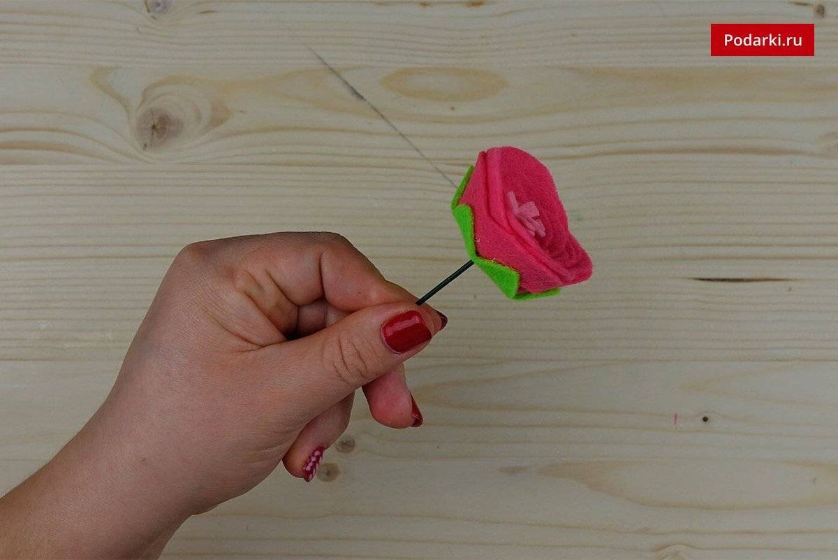 Шаг 5. Полученная конструкция помещается в центр собранного ранее красного цветка и закрепляется там с помощью силиконового пистолета.