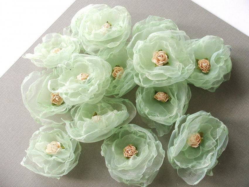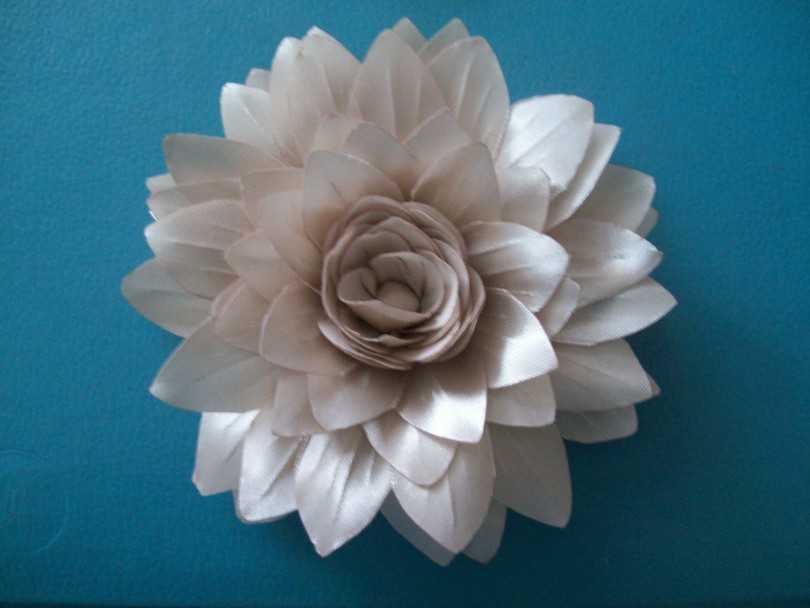 Красивые цветы получаются из тканей компаньонов. Более плотная ткань для внешних крупных лепестков дополняется полупрозрачной серединкой. Лучше выбирать светлые ткани, подтянуть цвет к платью можно окрашиванием.