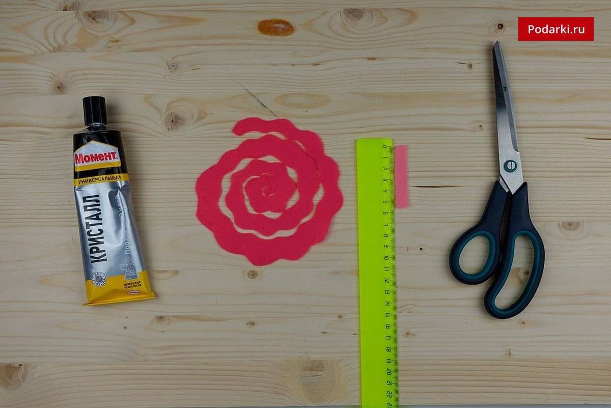 Наносим клей на заготовку и сворачиваем ее так, чтобы получилась розочка.