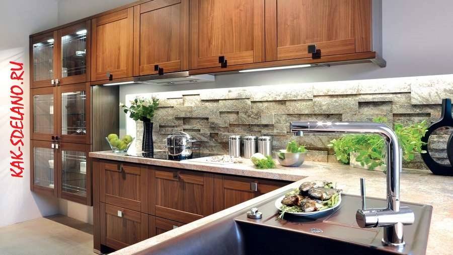 А если верхние модули – это узкие шкафчики, который развешаны выше, чем в стандартных вариантах, можно оформить подсветку непосредственно на кухонном фартуке.