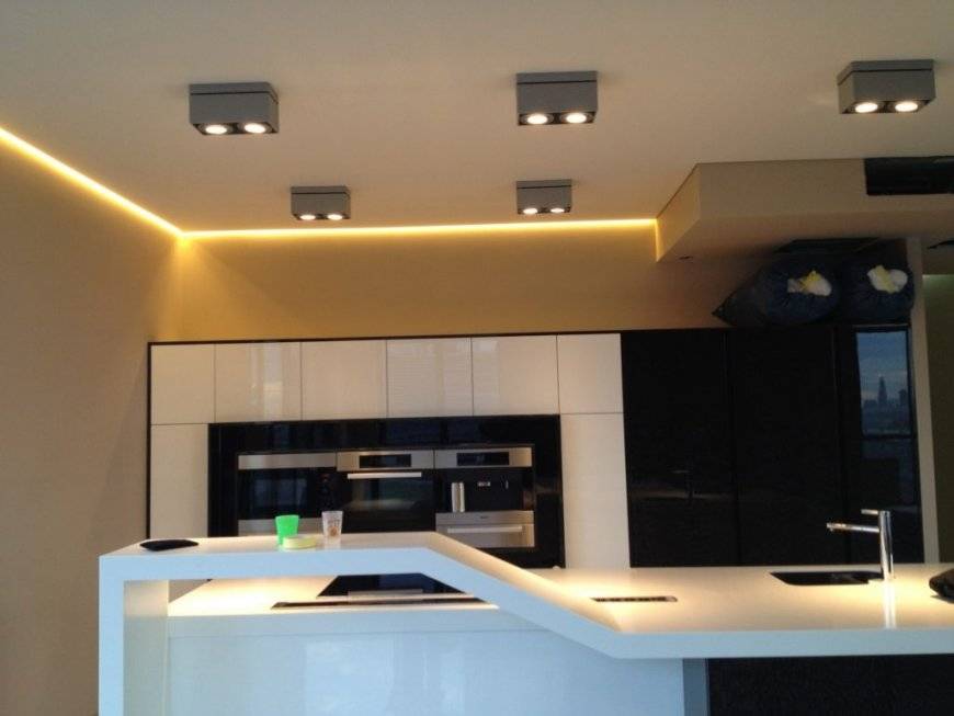 Помимо основного света многие практикуют еще и установку подсветки. Такой вариант оптимален с точки зрения функциональности и декора. Уместен на кухнях с любой площадью.