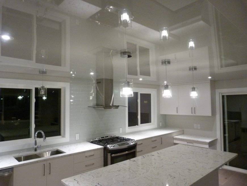 Другой вариант: линейные или шинные подвесные светильники. Они могут очень хорошо смотреться при высоких потолках. Их рекомендуется вешать на высоте не менее, чем в метре от столешницы.