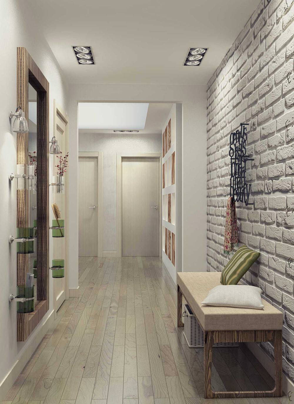 Стены под кирпич являются достаточно смелым и ярким интерьерным решением. Изделия имитирующие небольшие кирпичики привносят в интерьер особый шарм. Довольно часто для коридора применяют отделку белого цвета, она делает помещение более выразительным и необычным.