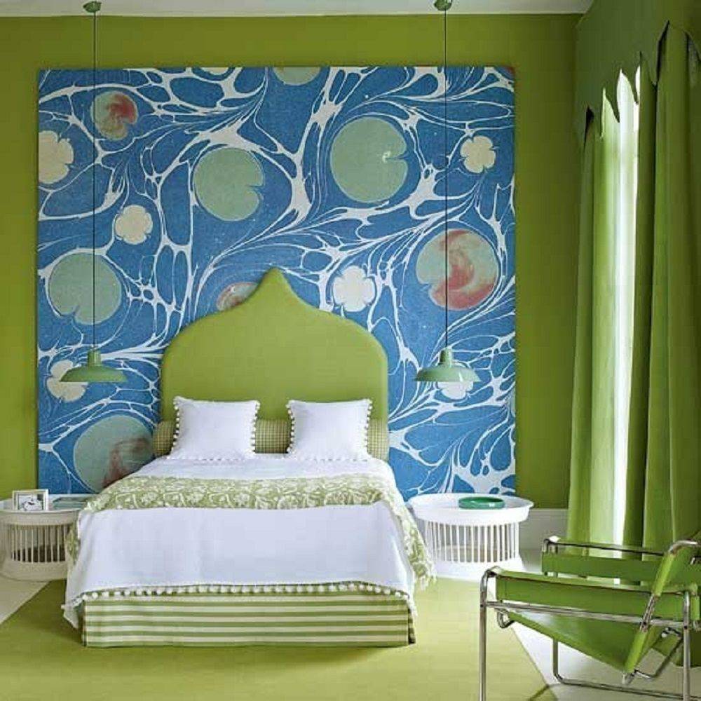 - Привнести в комнату нежные и воздушные нотки можно при помощи голубого и бирюзового изголовья. Такие варианты будут смотреться обворожительно на тускло-пурпурном, белом, молочном, кремовом, нежно-бирюзовом и нежно-сером фоне.