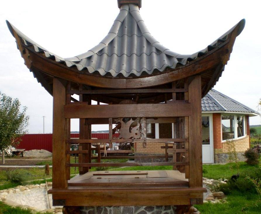 Самые популярные – это так называемые русские колодцы, состоящие из основания и барабана над ним. Барабан крутится вручную, чтобы достать ведро с водой. Сверху строится двускатная крыша.