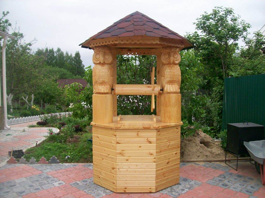 - Надстройки, которая может иметь круглую, квадратную или многогранную форму. Стенки колодца обкладывают и обшивают деревом, различными видами камней или кирпичом.
