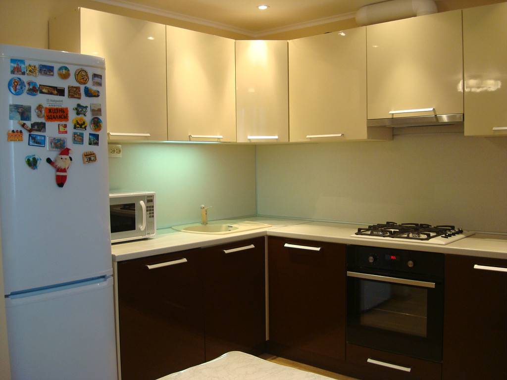 Необязательно использовать только два цвета в оформлении кухни. Дизайнеры рекомендуют обходиться тремя тонами, но не более.