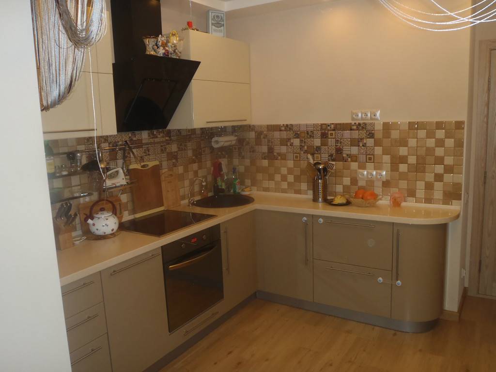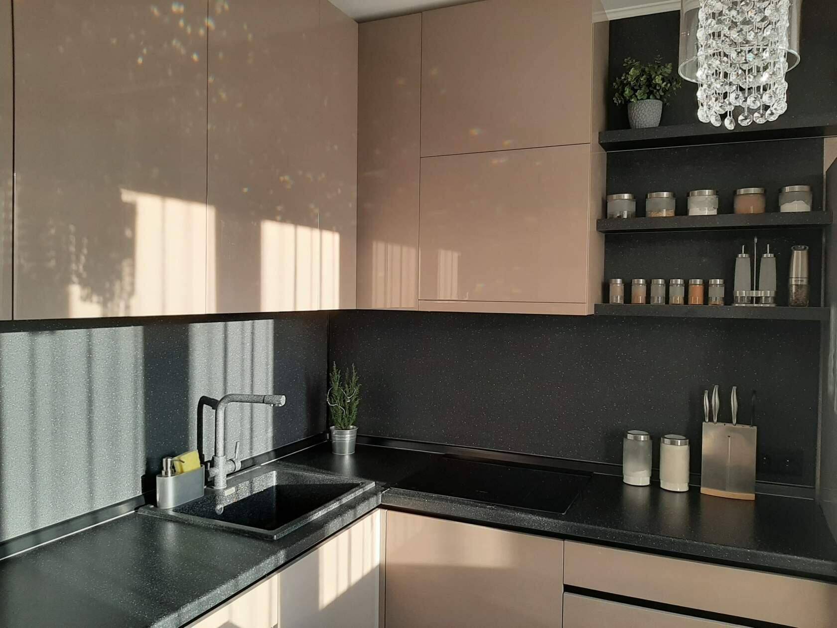 - Выбирая светлые тона как для фартука, так и для столешницы, не используйте прямой цвет. Лучше подобрать приглушенный светло-бежевый или светло-серый.