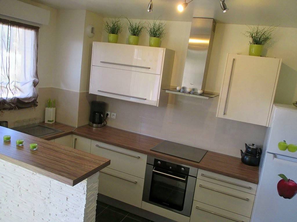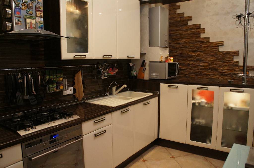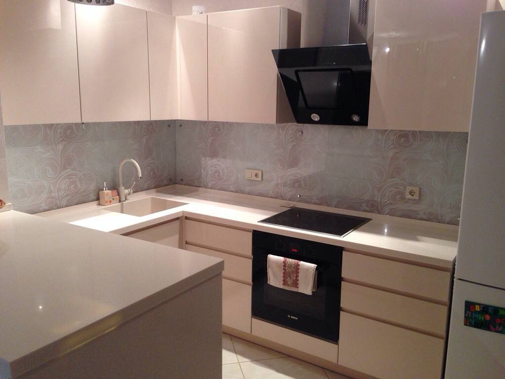 - Фартук и обои — белые, можно с мелким неброским рисунком.