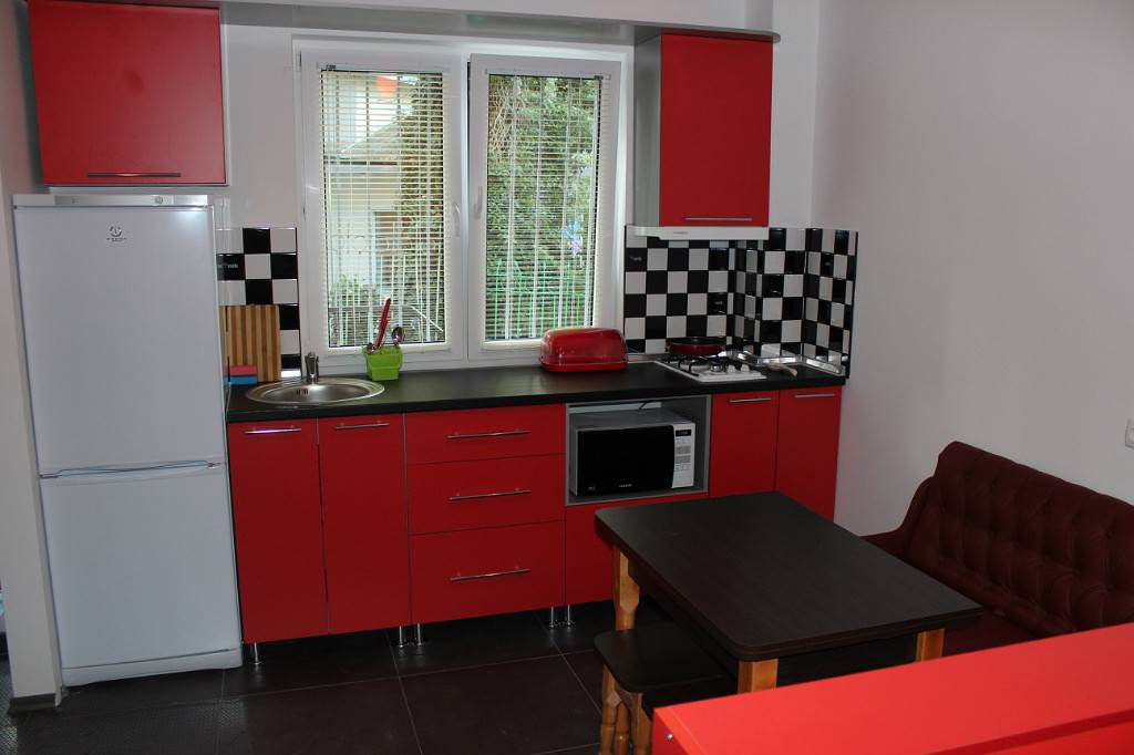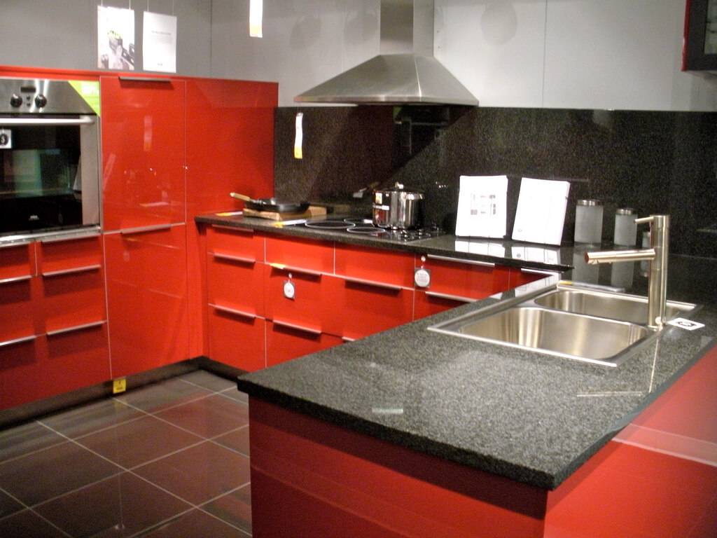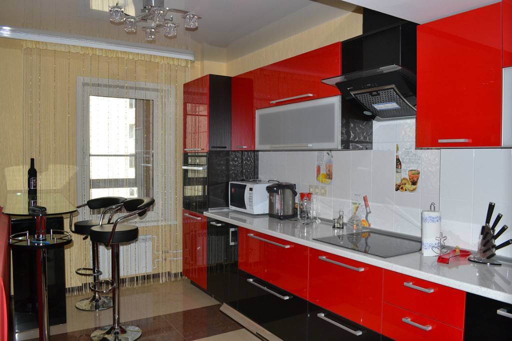 Сочетание красного и черного считается классическим, равно как и дизайн красно-белой кухни. Однако оно чересчур тоскливое и гнетущее, поэтому нуждается в разбавлении светлыми цветами: белым, бежевым, светло-серым и т.п.
