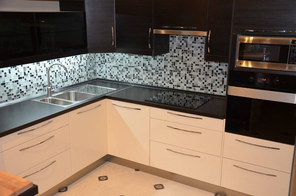 - Подойдут стандартные варианты цвета фартука, совпадающие с тоном столешницы, либо составляющие ему контраст, то есть белый фартук и красная столешница и наоборот.