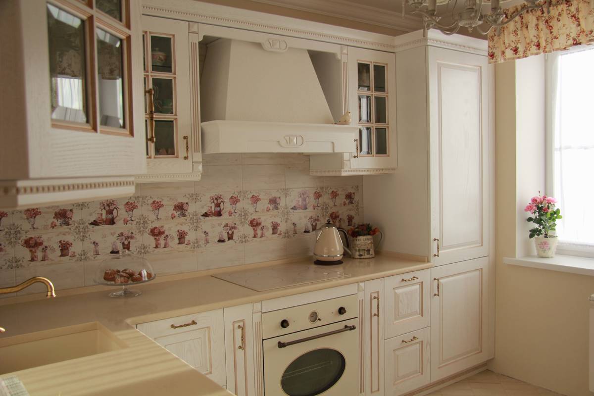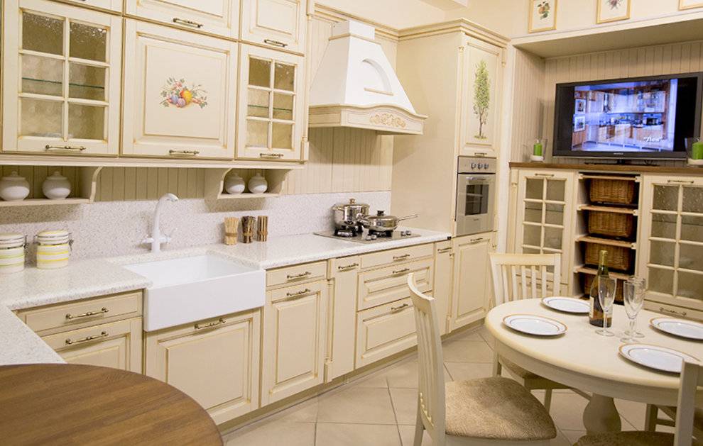 Не менее привлекательно смотрится ванильная кухня в прованской стилистике. Французский дизайн привлекает своей нежностью и легкостью. Цветовую палитру расширяют за счет пастельных оттенков, шоколадного и красного. Цветочные узоры и ванильная отделка поверхностей вызывают ассоциации с лавандовыми полями, солнечной весной.