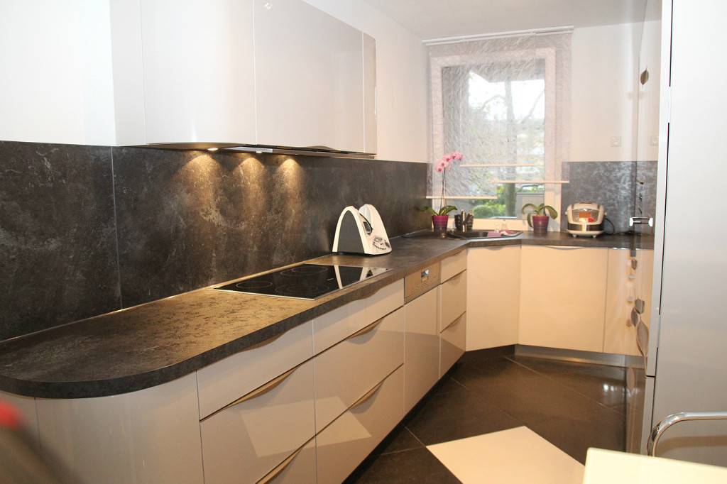 К такому смелому сочетанию, как красный с белым, лучше добавить нейтральных тонов. Например, черную столешницу