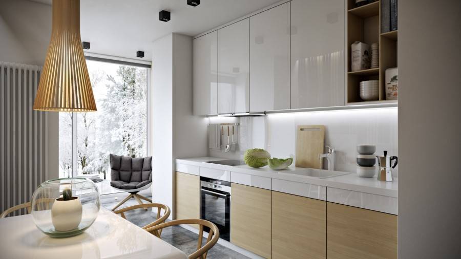 Схожие между собой контемпорари и скандинавское направления дизайна – это белый преобладающий фон, много натуральной древесины и несколько ярких акцентов. Здесь чаще всего кухонный гарнитур сливается с белоснежными стенами, диван выбирают нейтральный – бежевый или серый, а один объект – яркий и нестандартный.
