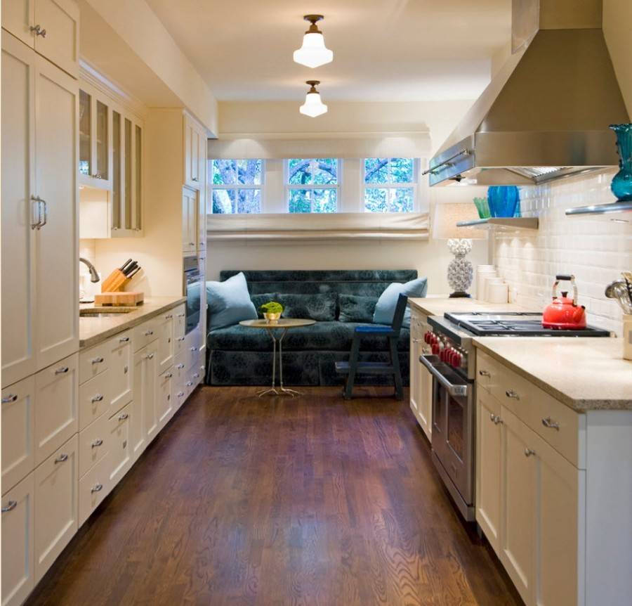 Для вытянутых и узких помещений отлично подойдет параллельная планировка при оформлении кухонного пространства. Вдоль одной из больших стен обычно располагают функциональную зону, а именно плиту, мойку, рабочую поверхность, а на параллельной ей стене устанавливают духовой шкаф, холодильное оборудование, буфет, шкафчики с красивой посудой, бар, бутылочницу и т.д.