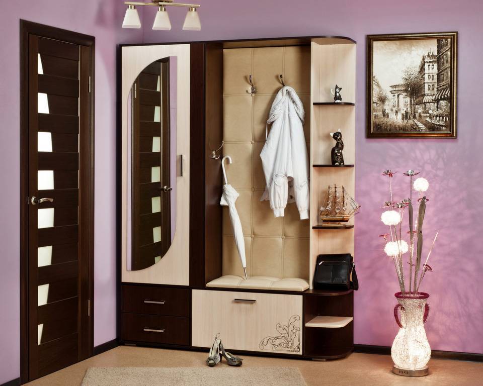 Если позволяет площадь, уместно поставить шкаф-купе. Часто встречающийся вариант – комбинированная корпусная конструкция, совмещающая в себе шкаф для верхней одежды, антресоли, полки для обуви, полки для аксессуаров, всевозможные ящички, нередко скамью. Не забываем о возможности размещения зеркал на дверцах шкафа. Удачным решением будет установить в конструкции подсветку под интерьер комнаты. Это и хороший дизайнерский ход, и дополнительный источник света.