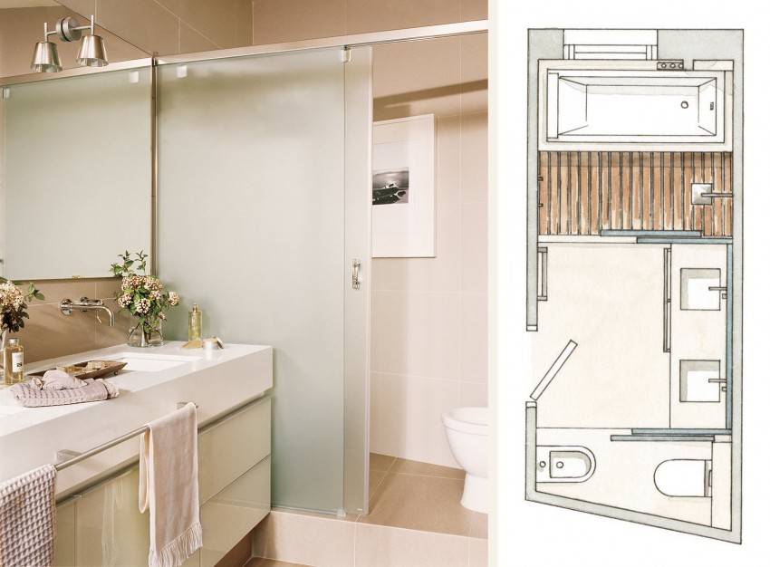 Самый большой элемент в узкой ванной комнате — ванна. Следует рассмотреть альтернативу душевой кабине, так как это может привести к значительной экономии пространства. Хотя форма корпусов в последнее время позволяет размещать ванны в узких местах, тем не менее, они занимают значительное пространство.
