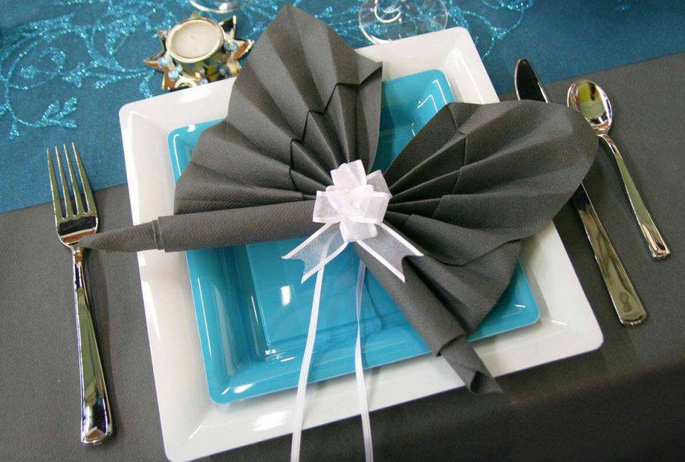 На столешнице все эти предметы ставятся справа от тарелки приглашенного. Салфетки должны интересно сочетаться с главным цветом выбранного столового сервиза. Салфетки складываются так, чтобы в процессе разворачивания они смотрелись максимально аккуратно. Эти изделия кладутся на тарелку для закусок, пока та не используется. С помощью данных аксессуаров можно задекорировать стол в любом модном направлении.
