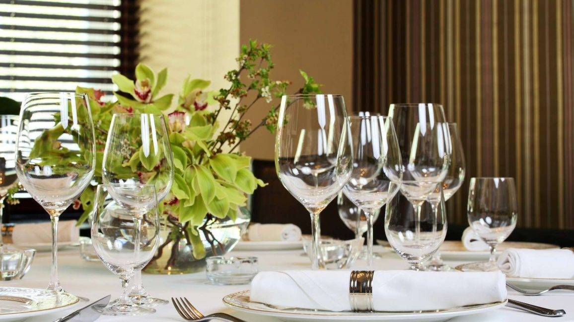 После размещения приборов идёт очередь расстановки стеклянной посуды. Для сервировки стола она должна быть выдержана в одном стиле. Каждый вид напитка подразумевает свой соответствующий бокал, и это неслучайно. Рюмки, фужеры, стаканы, бокалы размещают справа, выше сервировочной тарелки. Их порядок определяется очередностью подачи того или иного напитка.